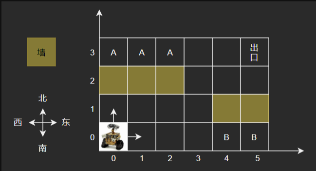 (0,0)出发,只能向东或者向北前进。出口固定为房间的最东北角,如下图的方格(5,3)。用例保证机器人可以从入口走到出口。房间有些方格是墙壁,如